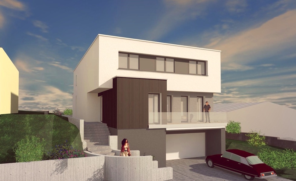 Maison unifamiliale passive (Classe AAA), en bois massif. Le rez-de-chaussée comprend un petit bureau et le séjour donnant sur un petit balcon du côté rue (ouest). La cuisine / salle à manger est orientée vers le jardin à l'est et est ouverte sur le séjour. A l'étage une bibliothèque en mezzanine donne sur le séjour et une grande baie vitrée au sud. Trois chambres pour enfants et la chambre des parents sont disposées autour de la mezzanine.